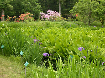 ![]() ミズバショウ池 ミズバショウの葉が大きくなり、そろそろカキツバタやヒオウギアヤメなどのアヤメ類が見頃になりつつあります。[2005.5.28.撮影] |