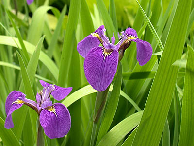 ![]() キリガミネヒオウギアヤメ Iris setosa Pall. ex Link var. hondoensis Honda(アヤメ科) ヒオウギアヤメの変種で、長野県霧ヶ峰に生育します。ヒオウギアヤメは内花被片(直立する小さい花弁)があまり目立たないのに対し、本種には2.5cmほどのへら型のものが見られます。[ミズバショウ池,2005.6.9.撮影] |