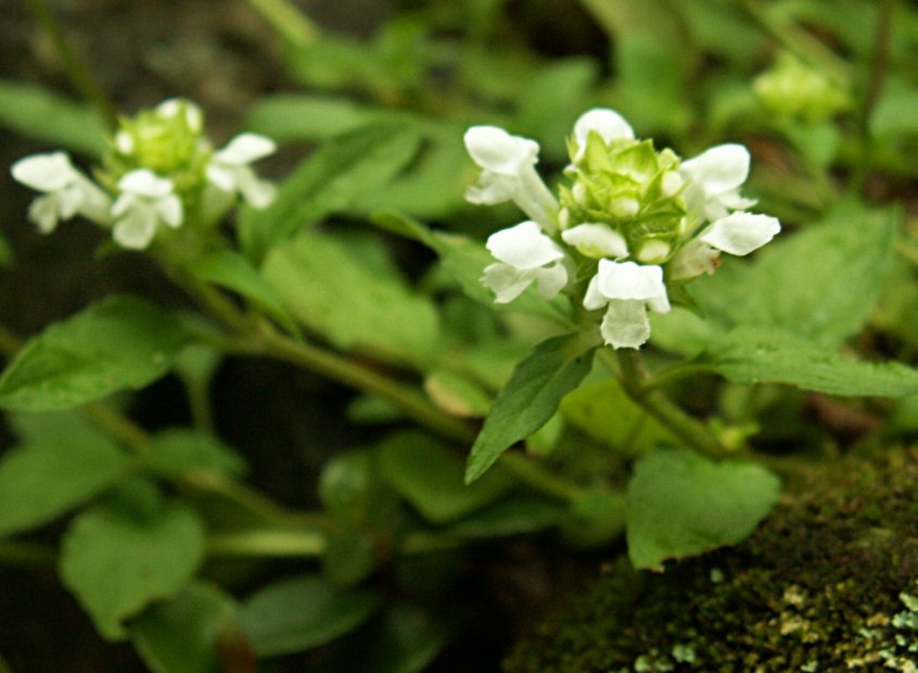 シロバナウツボグサ Prunella vulgaris L. subsp. asiatica (Nakai) H.Hara f. albiflora Nakai nom. illeg.(シソ科) ウツボグサは通常、花弁が紫色なのですが、まれに白色の品種が見られ、シロバナウツボグサと呼ばれます。日当たりの良い山野の草地に生育します。 [ロックガーデン 07.07.03 撮影] |