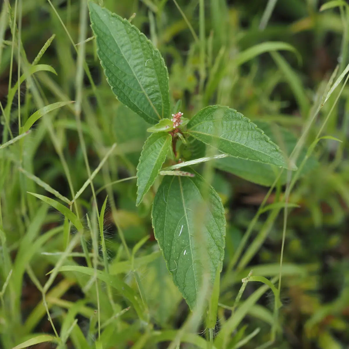 実験室入口付近~実験室前芝生周辺で見かけるようになりました。全国の道端に生えますが、園内ではこれまであまり見かけませんでした。和名の由来は葉がエノキに似ているからで、全体としてはムカゴイラクサ等のイラクサ科植物のようにも見えます。8月下旬~9月上旬頃、小さいピンク色の花を多数つけた穂状の雄花と、その付根の苞葉に雌花があります。