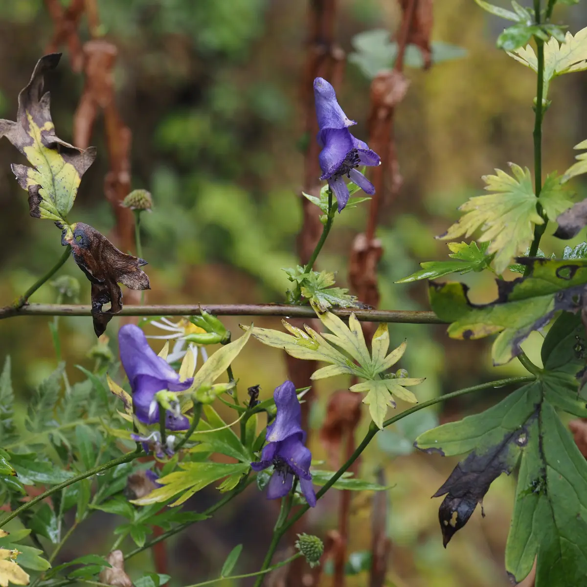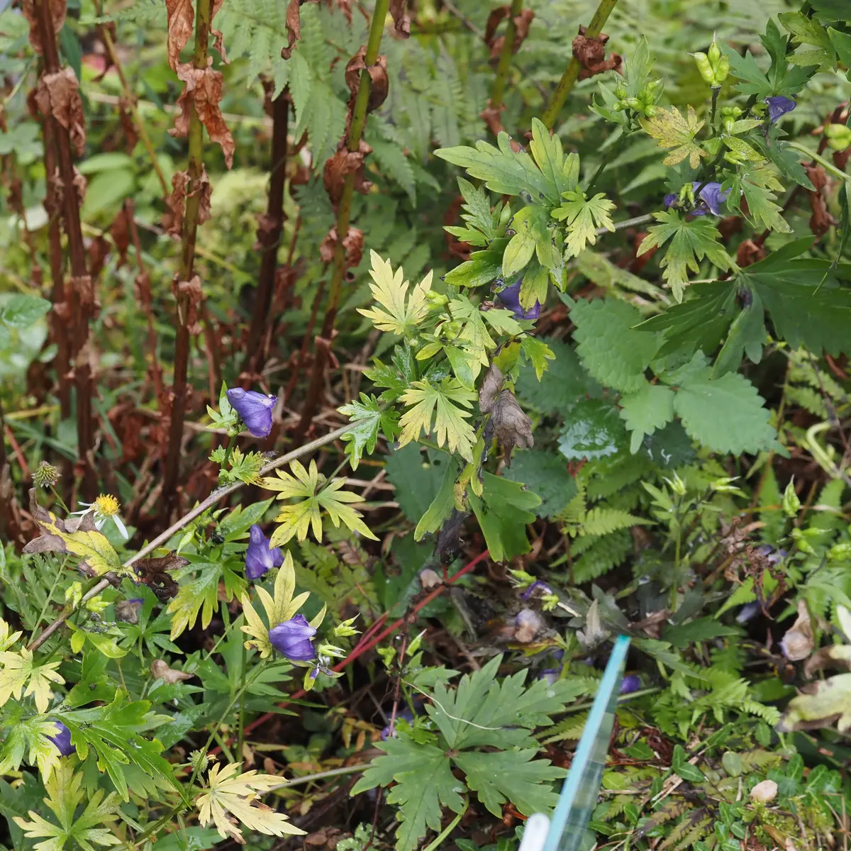 ボッグガーデン脇に新しく植栽されています。タカネトリカブトの亜種で、日光地域に自生するタイプのものです。ヤマトリカブトに比べて葉の切れ込みが深い、花柄に毛が無い、花に毛が多い、茎がジグザグに折れる等の特徴があります。植栽個体は鹿沼市横根高原由来のもので花柄の毛には変異が多く、あるものと無いものが混じっています。