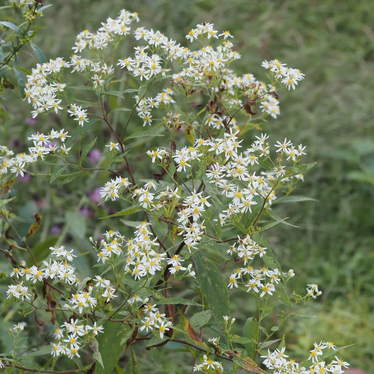 フィールドステーション棟~駐車場付近、スイレン池付近とミズバショウ池周辺~コウホネ池北側等に植栽されています。シロヨメナに似ますが、より大型で花つきも良いです。