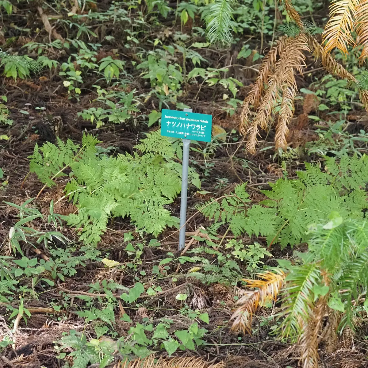 駐車場西側林内や石標13番付近、石標12番から52番方面に少し進んだ辺りに植栽されています。春から秋にかけて葉を出し、初夏に胞子のつく柄を出します。同属の植物にはオオハナワラビがあります。