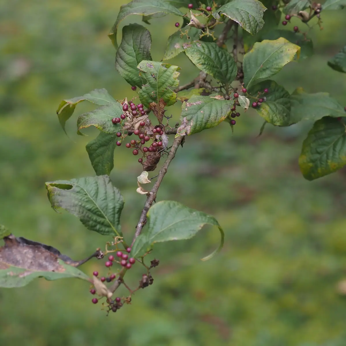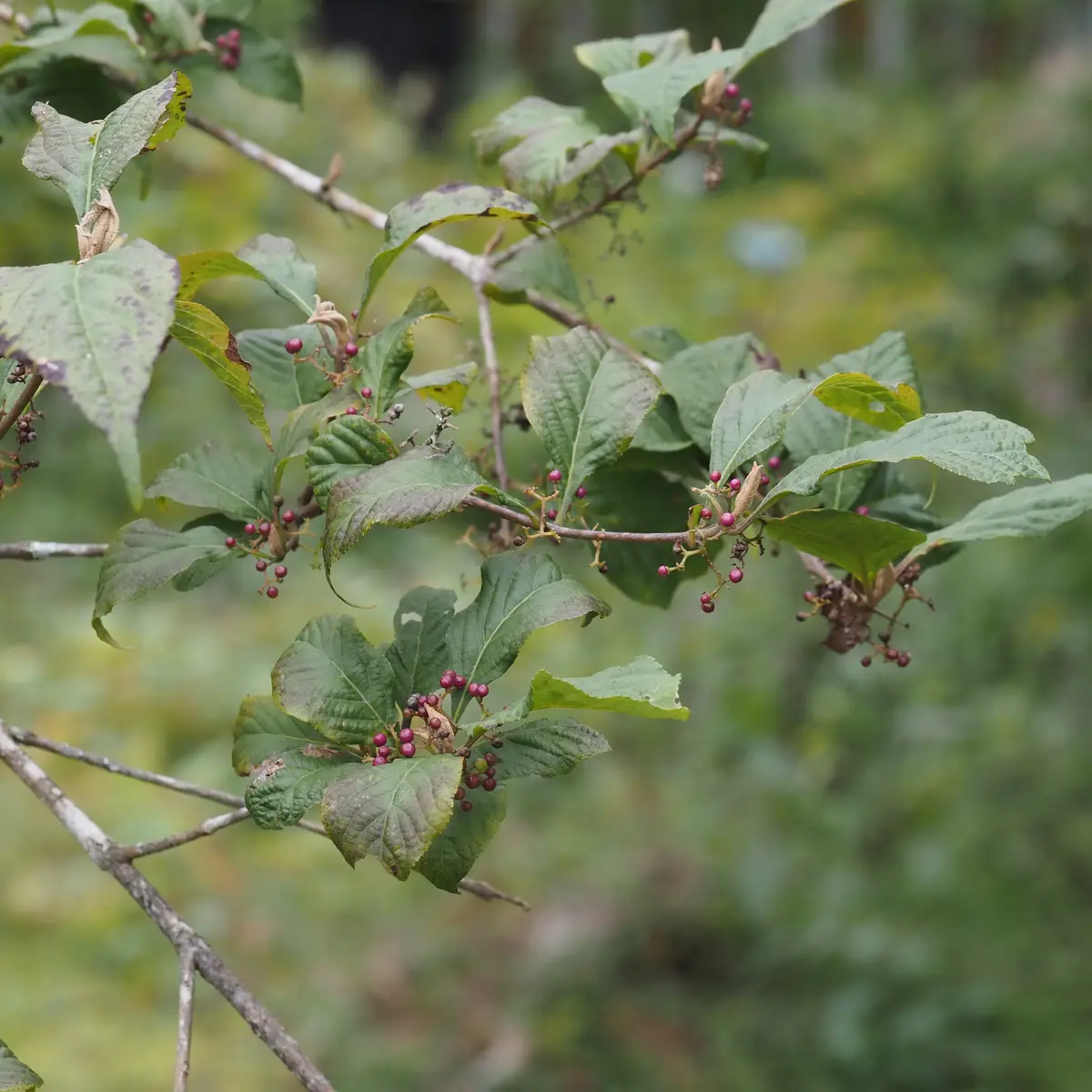 サクラ園入口付近の'思川おもいがわ'の脇に古くから植栽されている個体です。形態や植栽場所から外来のものと思われますが、種名等を紛失している状態で、植栽記録を確認中です。秋にはムラサキシキブ同様、紫色の果実を実らせます。
