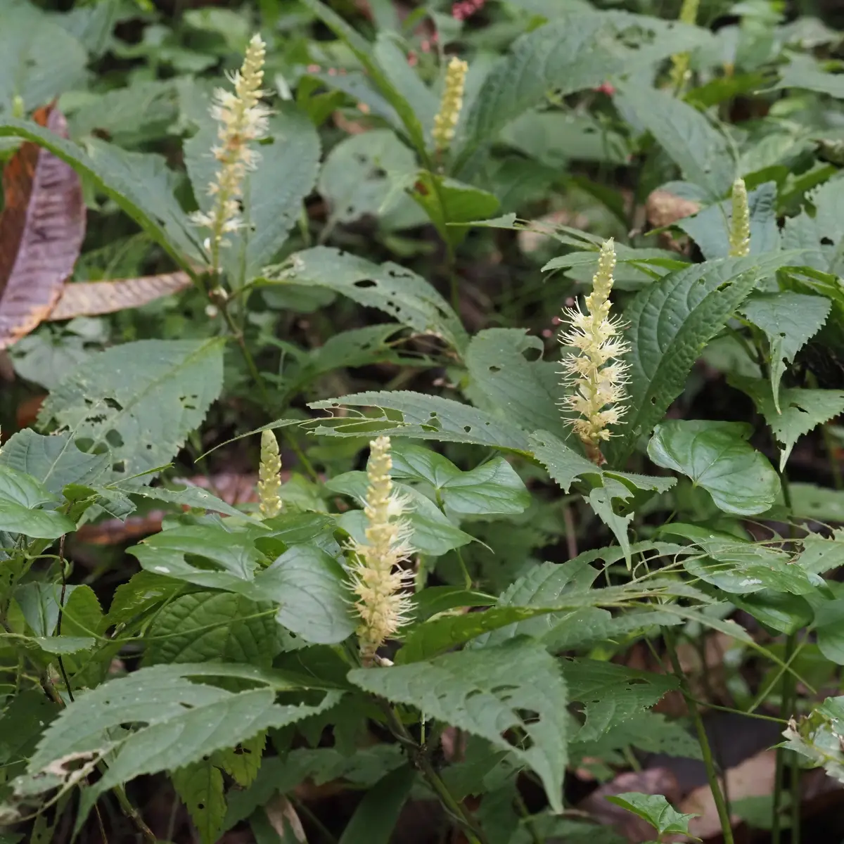 フィールドステーション棟南側や石標2~3番付近が観察しやすい他、石標7番付近、石標18~19番南側等でも観察できます。同属の仲間にはミカエリソウとその変種、オオマルバノテンニンソウがあります。ヒマラヤ〜中国周辺に分布するLeucosceptrum 属にまとめられていましたが、独立したようです(旧学名L. japonicum )。