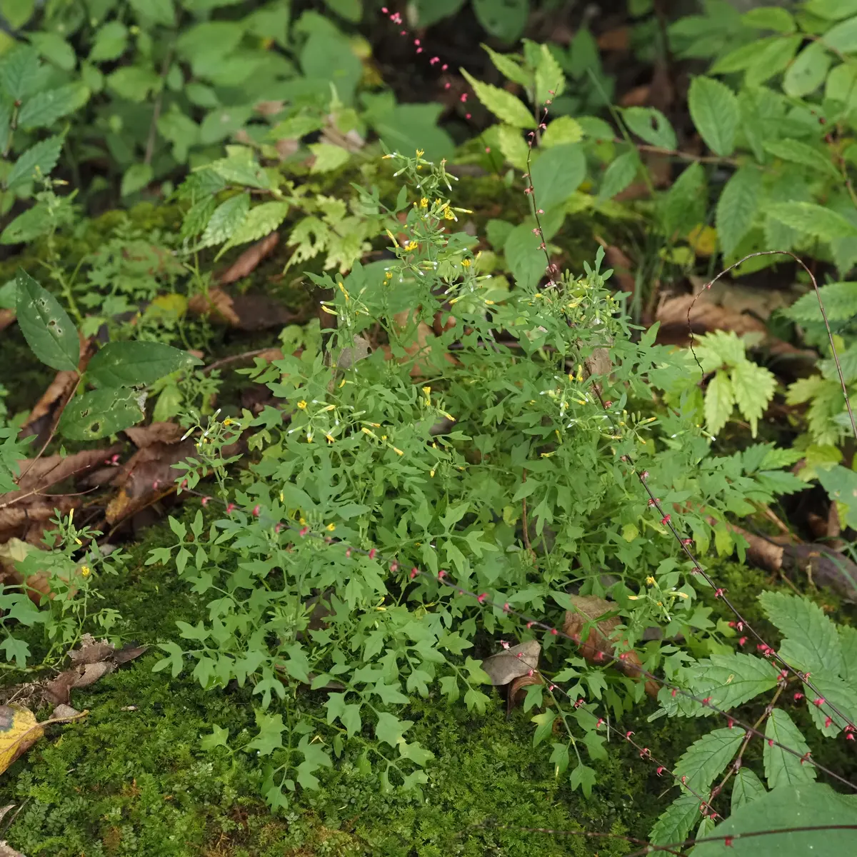 ボッグガーデン南側と石標7番南西側川沿いの岩の上に植栽されている他、カキツバタ池西側川沿い、石標84番~カキツバタ池途中の岩上等でも観察できます。名前の由来は葉がケシ科のクサノオウに似ることからでしょうか。ノギクと名付けられていますが、ノコンギク等のシオン属ではなくアゼトウナ属の多年草で、花色は黄色ですが花は閉じがちです。園内に同属の植物は他にヤクシソウがありましたが、フィールドステーション棟建設で無くなってしまいました。