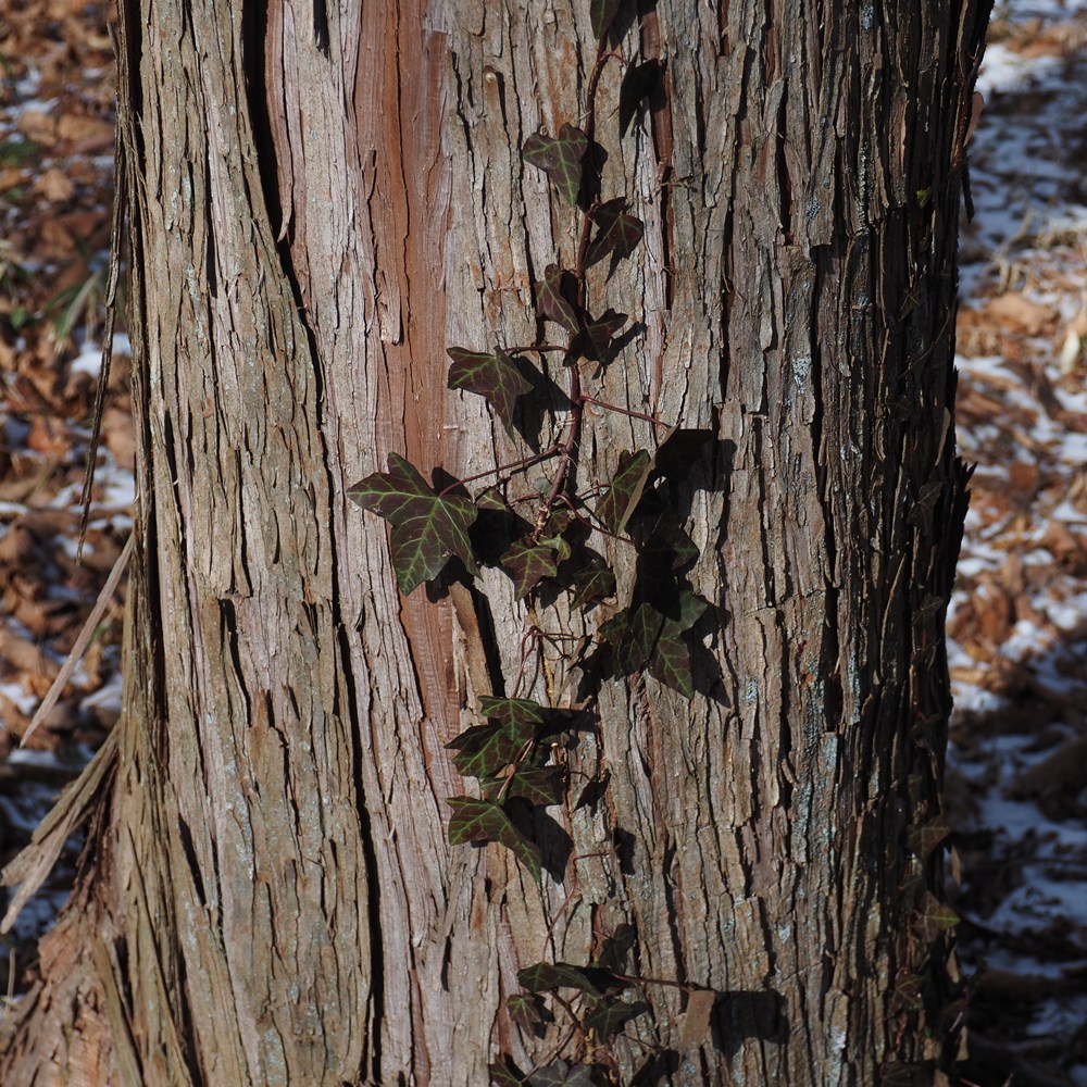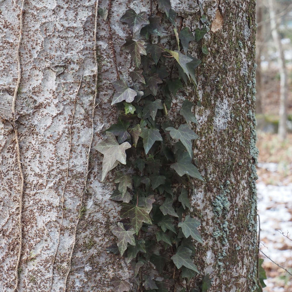 石標11番北側のミズナラ林に生えているのを確認しました。ツルマサキなどと同じ常緑性のつる性木本で、地面を覆うように生えてはいるものの、立ち上がって大きくなっている個体は見つかっていません。日光の冬は寒く常緑広葉樹が成長しづらいことや、下草刈りで毎回刈られてしまうためかもしれません。分布は日本、朝鮮、台湾のようです。