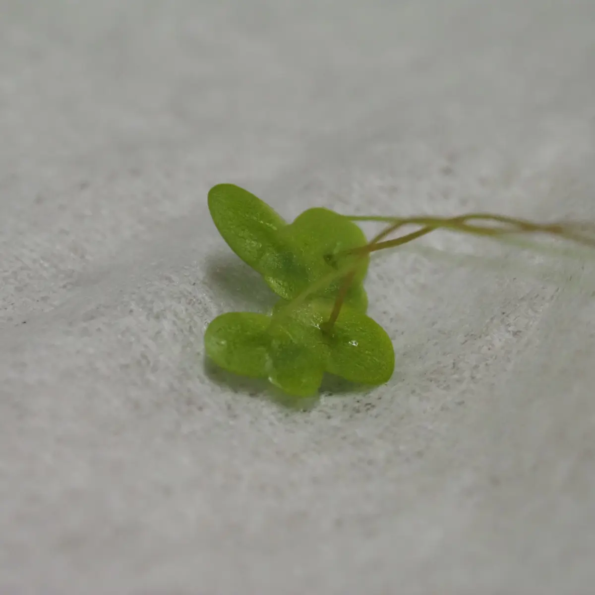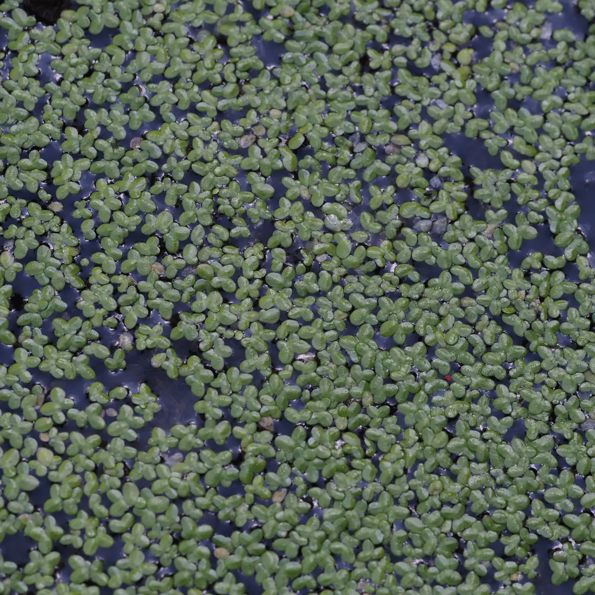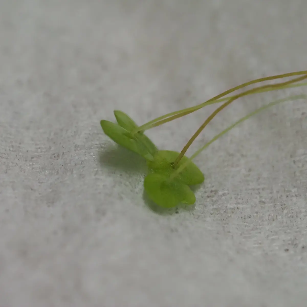 2025年10月、ワスレナグサを取り除いたミズバショウ池やコウホネ池で増えていました。世界的に分布するウキクサの一種です。気温が下がった秋に増えてきたことや、葉状体裏が緑色で根の付根はややくぼみ翼が見られないこと、根の先端が丸いことから本種としました。葉状体単体の長さは2.5~3mm程度、幅は1.5~2mm程度で、葉状体単体に対して1本の根が出ています。同属の仲間にはヒンジモがあります。