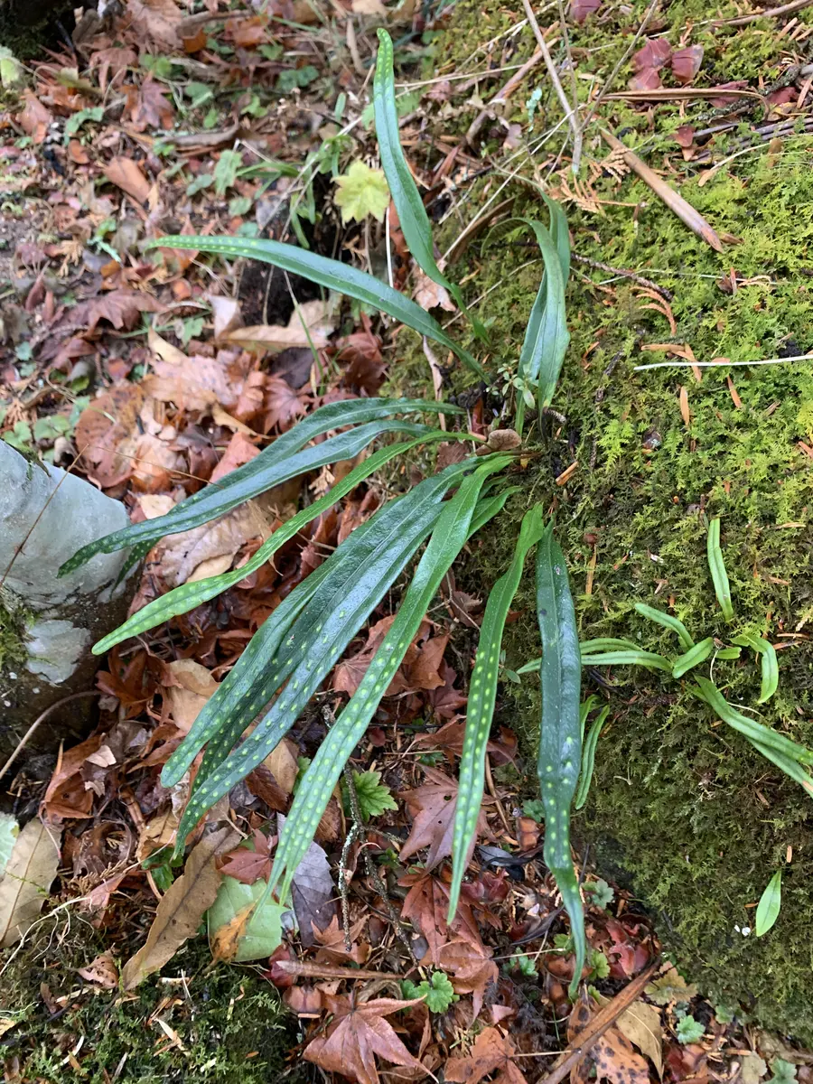 庁舎前ロータリーの岩に着生しています。ノキシノブは倍数体、雑種なども確認され同定が難しいですが、ノキシノブにしては大型(20~25cm程度)で葉は黒っぽく艶がある、葉柄が黒く長い等の特徴から本種としました。2018年に種として認められた新しい種です。似た仲間にはヒメノキシノブやビロードシダがあります。