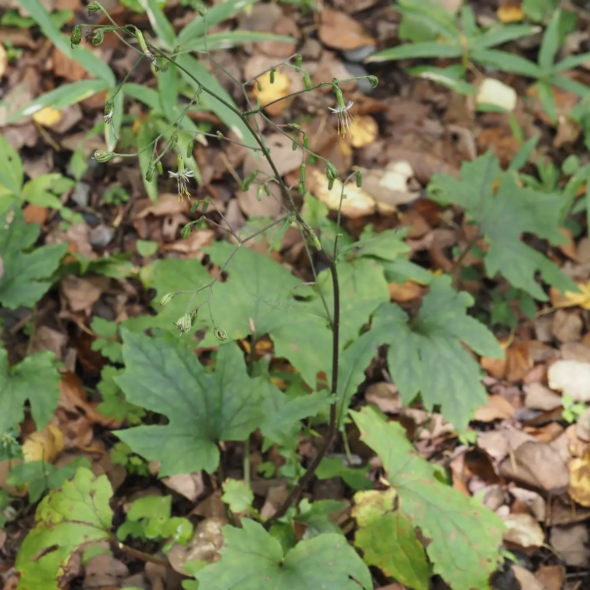 石標85番周辺エリアに群落がある他、カキツバタ池南東~石標73番付近にも植栽されています。葉の形が特徴的なキク科の多年草です。開花量には豊凶があり、花茎があまり立ち上がらない年もありますが、2025年は花茎がたくさん立ち上がりました。学名がPrenanthes acerifolia より変更になりました。