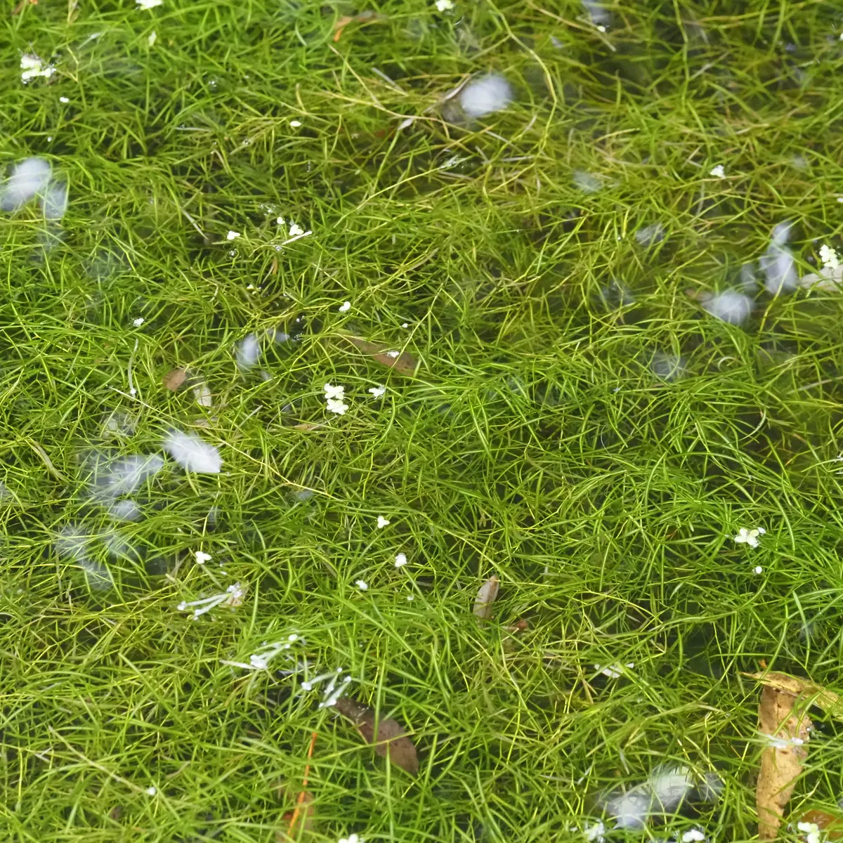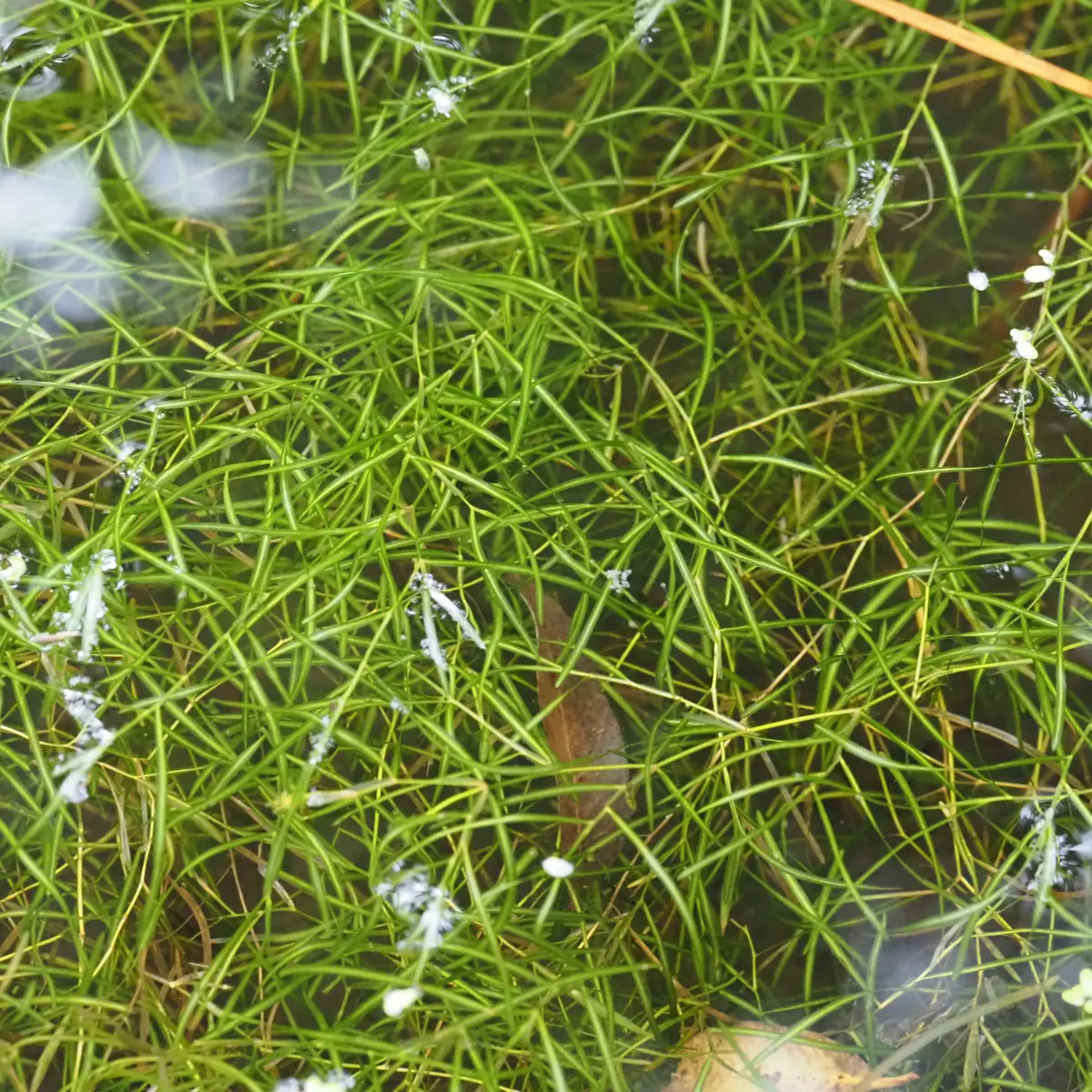実験室東側のスイレン池に広がっています。幅2mm、長さ3~4cm程度の細長い葉を互い違いに出す細長い水草です。花期は5月下旬~6月上旬頃と思われます。近年減少している植物の1つで、環境省レッドリスト2020では準絶滅危惧に指定されています。