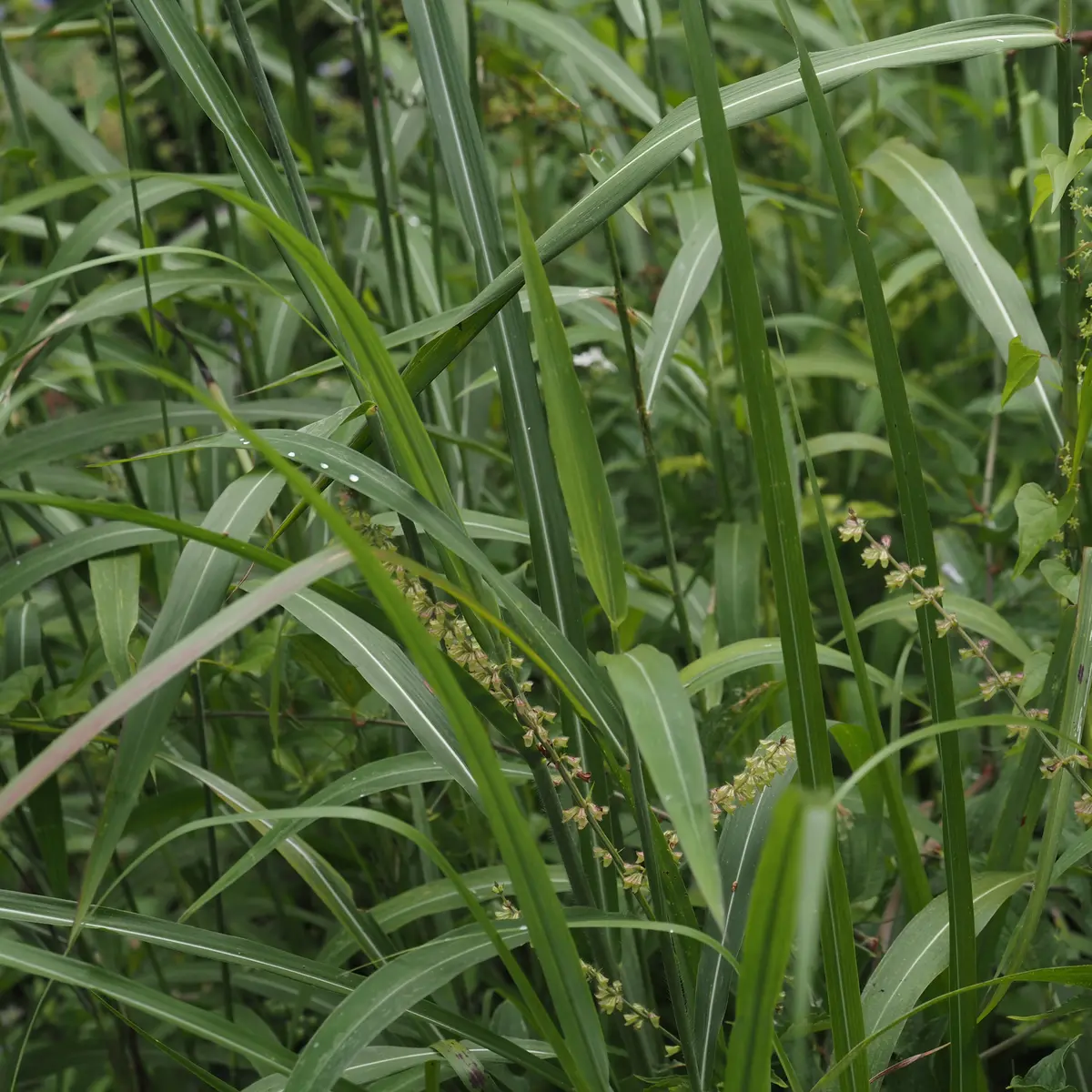 石標50~18番付近にススキと混ざって生えています。草丈は1.5~2m程度で大きく、葉はススキとよく似ていて見分けが難しいですが、花の特徴は異なります。